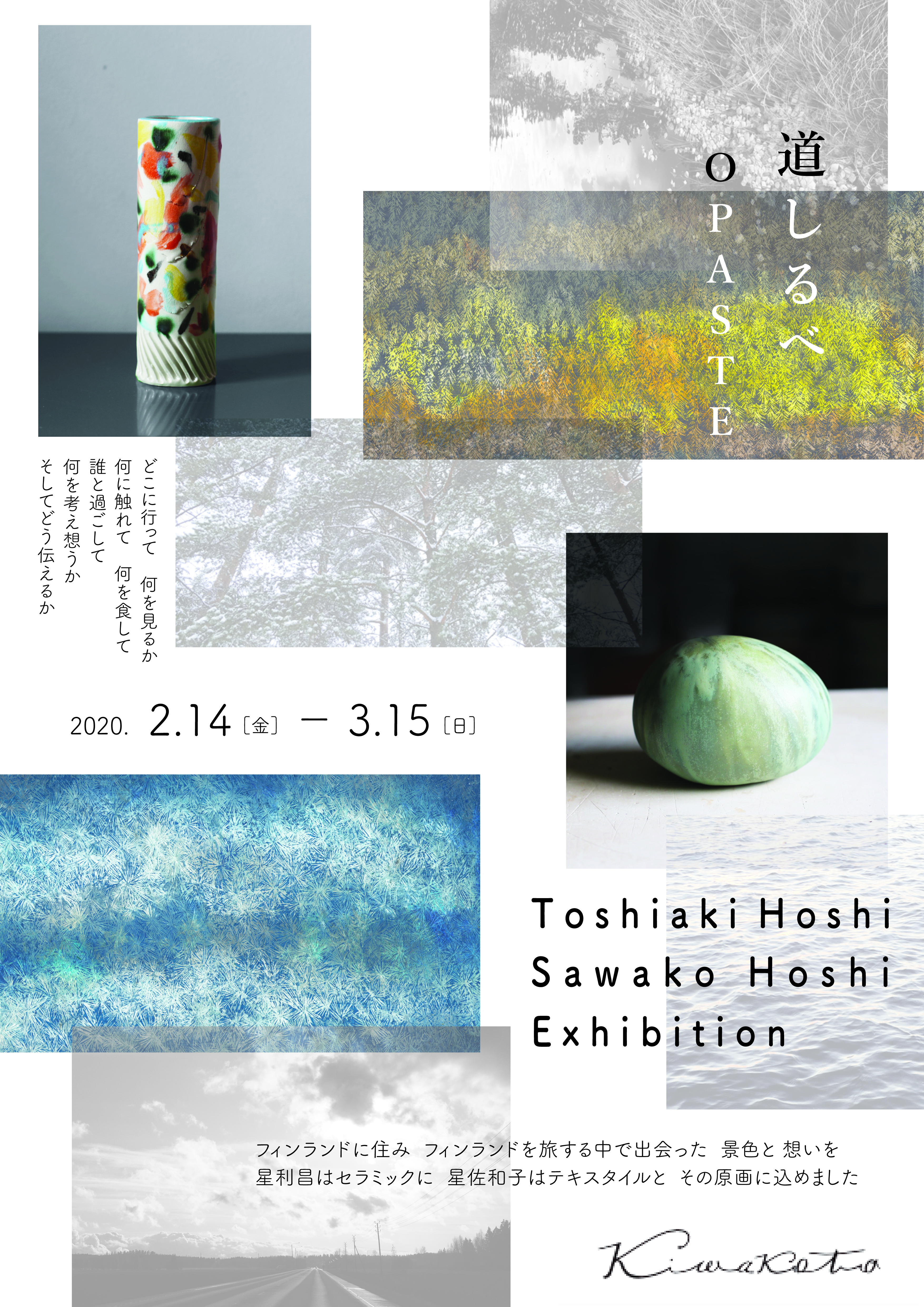 フィンランドに住み、フィンランドを旅する中で出会った景色と想いを、星利昌はセラミックに、星佐和子はテキスタイルとその原画に込めました。 「道しるべ OPASTE」 Toshiaki Hoshi Sawako Hoshi Exhibition 2020.02.14(金) ー 2020.03.15(日) Kiwakoto本店(10:00AM~7:00PM) 入場無料 https://kiwakoto.com/news/event-20200207/ Kiwakoto 〒604-0911 京都市中京区河原町通二条上る清水町359 ABビル1階 アクセス 地下鉄東西線「京都市役所前駅」徒歩3分 TEL:075-212-0500 E-mail : info@kiwakoto.com |